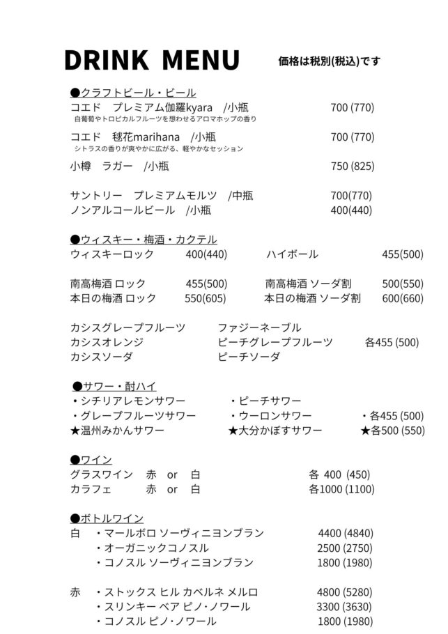 なお、大人数のコース料理等の場合はスタッフ二人で対応いたします。ドリンク・フードメニューがリニューアルいたしました!
