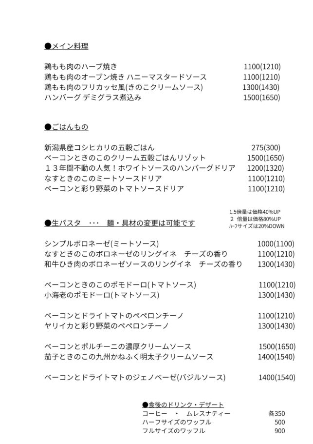 ①税込1000円・・・パスタ、ソフトドリンクバー